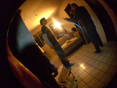 Pero antes de todo esto llegue al lugar a las 10:30am. Marcio ya estaba ahi esperandome, y por un rato nos pusimos a hacer unas tomas de las preparatorias para una de las escenas de BT. Al poco tiempo me llamo el Profesor Enrique Briseño, quien fue quien nos invito al evento y a quien todos conocemos por el apoyo y colaboracion que ha tenido con la comunidad de Cine local. Lo que pasa es que, por si no recuerdan o no vieron "Septimo en la Frontera", el profe aprovecha este evento para realizar un certamen de cortos para los alumnos de la carrera, y de echo yo fui uno de los jurados hace tres años cuando me invito por primera vez (Los otros dos jurados eran Alvaro y Carlos Sarabia). Pues me hablo en ese rato para que viera los cortos que participarian este año. Pues ahi vamos yo y Marcio, y nos echamos todos los cortos. Obvio que tienen los errores que uno espera de un corto primerizo, pero bueno, aunque sean no hicieron la babosada que yo hice cuando hice mi corto en 5to semestre de no quitarle la fecha a la camara, pero bueno. Sin embargo, ninguno era mejor que otro, por lo menos para mi no. Todos tenian lo suyo, si un corto fallaba en una cosa se ezcedia en otra. Y asi sucesivamente. Pero bien, los vimos, y antesito de acabar el profe nos informa que la hora ha llegado.